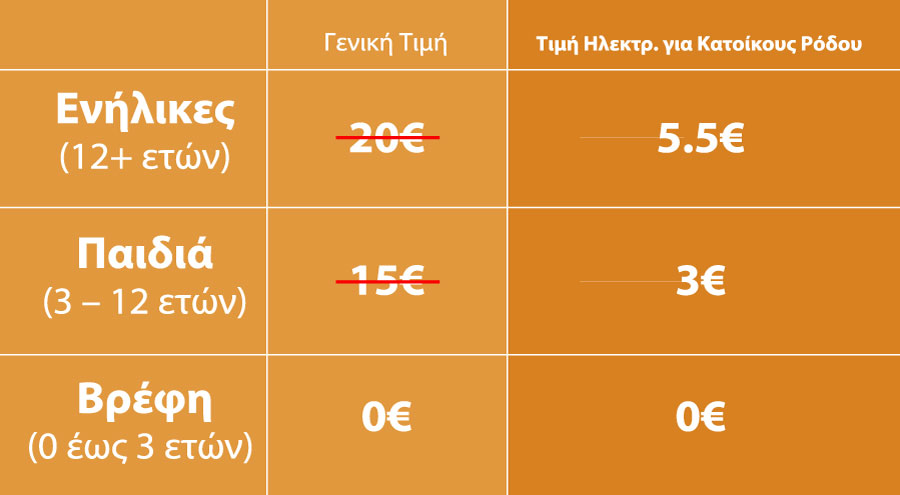 - H έκπτωση ισχύει μόνο για την αγορά ηλεκτρονικού εισιτηρίου. Η αγορά εισιτηρίων στην είσοδο χρεώνεται με την κανονική τιμή εισόδου (20 ευρώ το ενιαίο εισιτήριο και 15 ευρώ το παιδικό).